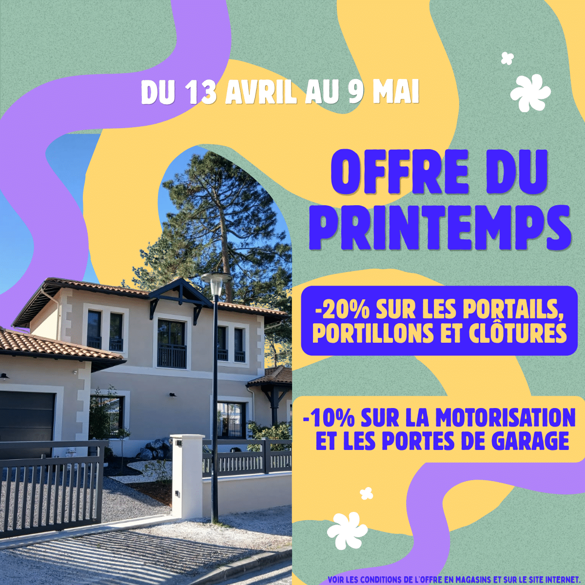 Jusqu’au 9 mai 2026, profitez de 20% de récution* sur les portails, portillons, clôture et 10% de réduction sur la motorisation et les portes de garage.